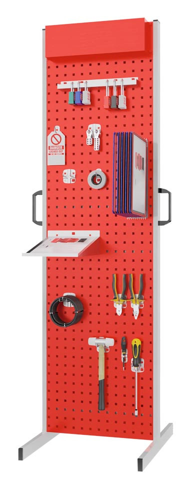 · Stabile Stahlkonstruktion · Werkzeuglose Montage · Beidseitige Nutzung · Schlag- und Kratzfeste Kunststoffbeschichtung · Standmodul RAL 7035 Lichtgrau · Lochplatten RAL 3020Verkehrsrot · Mit 13-teiligem Werkzeughaltersortiment · Ausstattung erweiterbar · Lochmaß : 10 x 10 mm · Lochabstand 38 mm