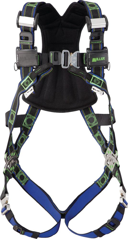 Zweipunkt-Auffanggurt, EN 361 mit DuraFlex®-Gurtband · das patentierte, elastische Gurtband und die PivotLink™-Verbindung auf Taillenhöhe erlauben bequemes Bewegen und Vorbeugen · Automatikverschlüsse ermöglichen ein leichtes und schnelles Anlegen · zusätzlicher Schutz durch Komfortrückenpolster · geschütztes Etikettenfach · patentierte Schnelleinstellung