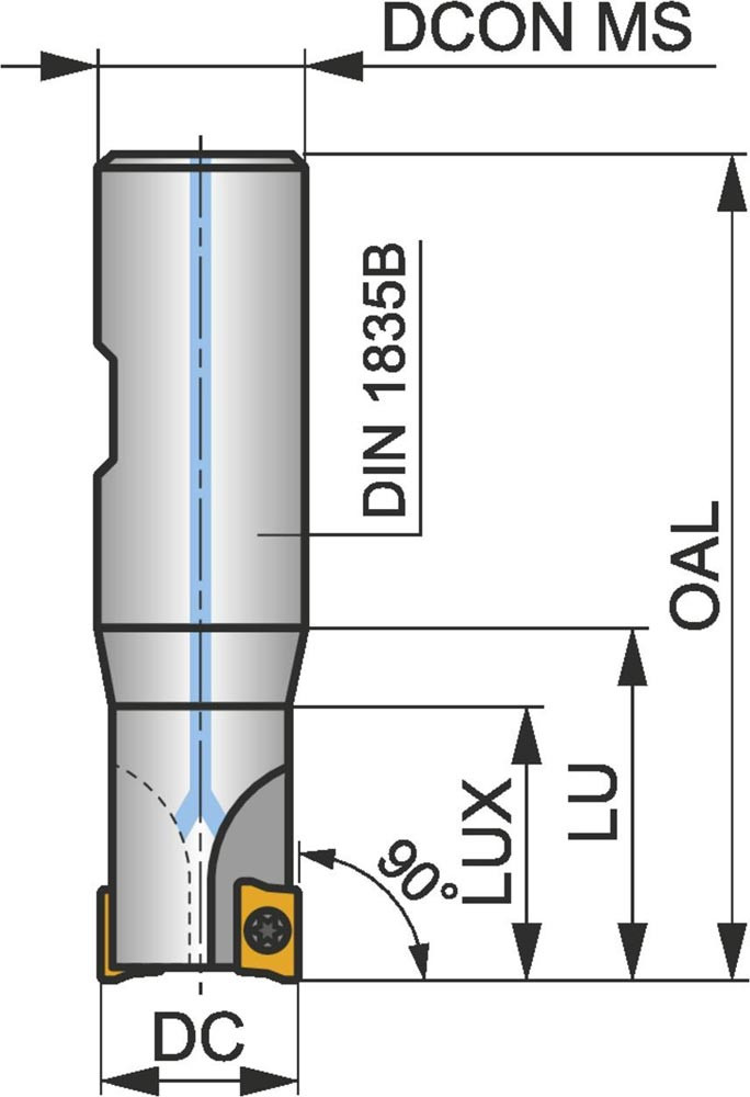 Eckfräser mit positiver/negativer Geometrie zum spannen von 4 Stück ADMX 11T3.. oder ADEX 11T3.. einseitigen Wendeschneidplatten · Schnittdurchmesser 32mm mit 90° Anstellwinkel und 32mm Weldon Schaft gemäß DIN 1835B · 42mm Funktionslänge 102mm Gesamtlänge · Kühlkanalbohrung zum Kopierfräsen · flachen Schulterfräsen · flachen Nutfräsen · Rampen · Helikalen Fräsen · Tauchfräsen und progressiven Eintauchen mit einer maximalen Schnitttiefe von 9.0mm