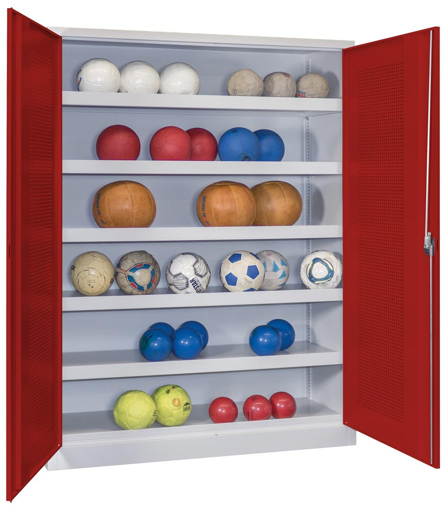 Ballschrank m. Lochblech Flügeltüren, BxTxH 1000x500x1950 mm, 5 lackierte Verstellböden mit Aufkantung, Schloss, RAL 7035/3003 E6020989