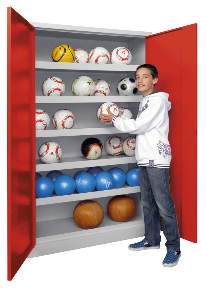 Ballschrank m. Vollblech Flügeltüren, BxTxH 1200x500x1950 mm, 5 lackierte Verstellböden mit Aufkantung, Schloss, RAL 7035/3003