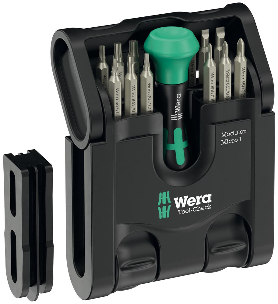 Werkzeugset für feinmechanische Verschraubungen ∙ Mehrkomponentiger Kraftform Micro Griff mit Abrollschutz und drehbarer Kappe ∙ Kraftzone mit integrierten Weichzonen für Übertragung hoher Löse- und Anzugsmomente ∙ Die drehbare Kappe und die Schnelldrehzone unterhalb dieser Kappe ermöglichen blitzschnelles Zwirbeln ∙ Kann mit dem Tool-Check Modular Adapter oder dem flexiblen Tool-Check Modular Scharnier mit anderen Elementen des Tool-Check Modular Systems verbunden werden