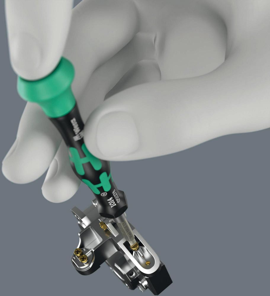 ermöglicht die individuelle Zusammenstellung unterschiedlichster Tool-Check Modular Elemente · für feinmechanische Verschraubungen · Bits-Handhalter für Bits mit 4 mm Außensechskantantrieb · Mehrkomponentiger Kraftform Micro Griff mit Abrollschutz und drehbarer Kappe · Kraftzone mit integrierten Weichzonen für Übertragung hoher Löse- und Anzugsmomente