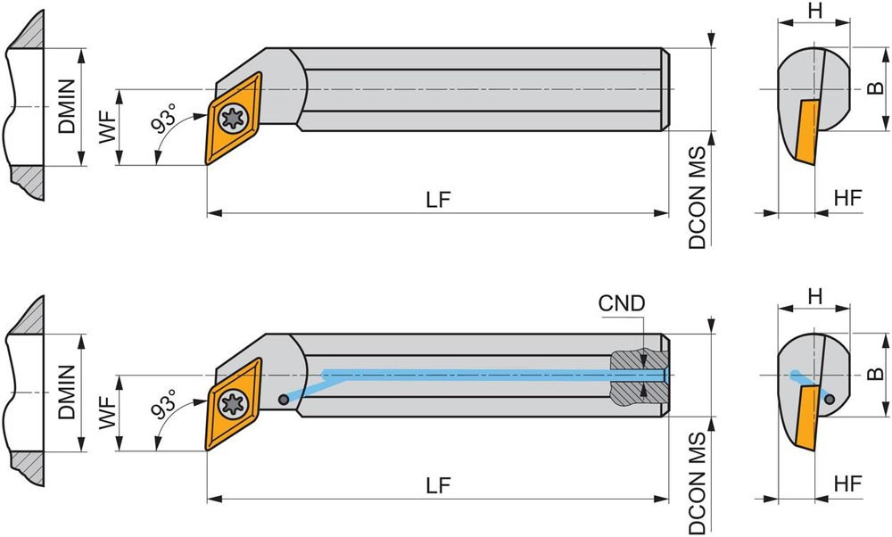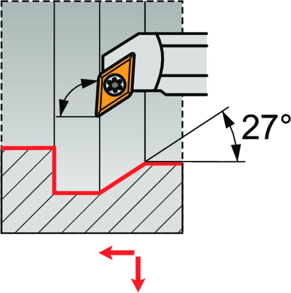 Dreh-Bohrstange mit Schraubklemmung zum spannen von 55° Rhombus positive Wendeschneidplatten mit einem Innenkreisdurchmesser von 6.35mm · 2.38mm Dick (ISO Bezeichnung DC.. 0702.. ) · rechte Ausführung zum 93° Längsdrehen mit abgesetzem Schaft · Stahl mit Kühlkanalbohrung · 10mm Durchmesser x 100mm Länge für Innenkegeldrehen · Kopierdrehen in einer und mehreren Richtungen und Längsdrehen mit und ohne Schulter