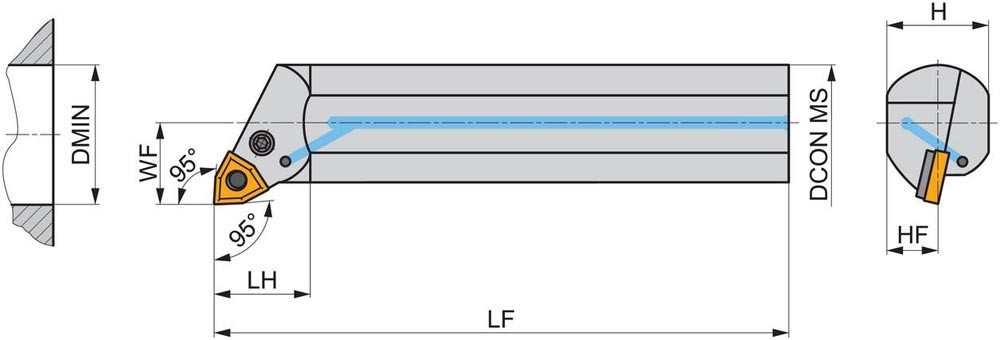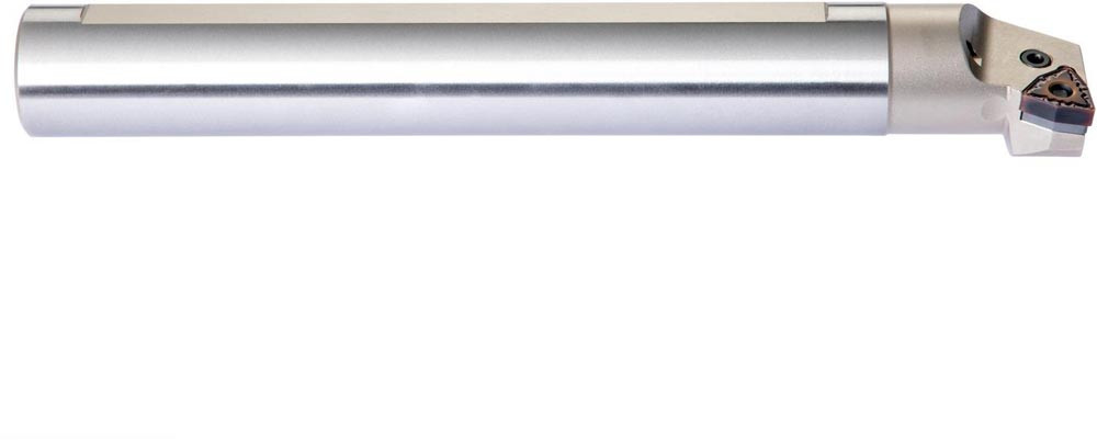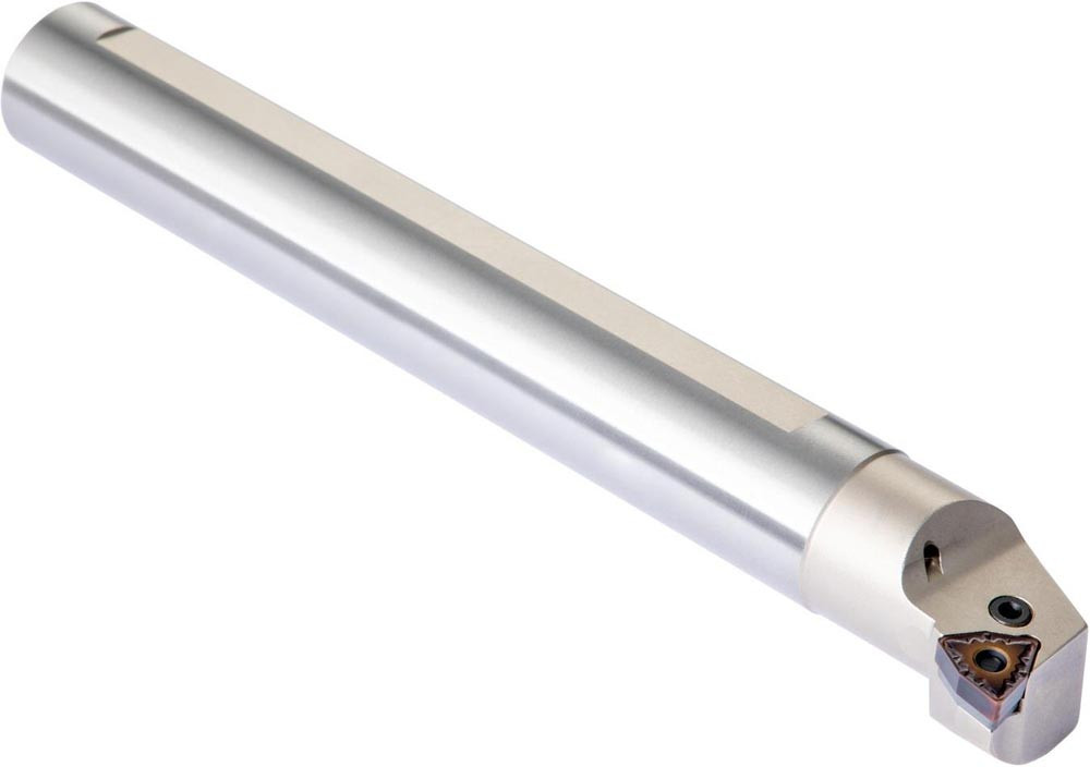 Dreh-Bohrstange mit Kniehebelklemmung zum spannen von 80° Trigonal negative Wendeschneidplatten mit einem Innenkreisdurchmesser von 9.525mm · 4.76mm Dick (ISO Bezeichnung WN.. 0604.. ) · linke Ausführung zum 95° Stirn-und Längsdrehen mit abgesetzem Schaft · Stahl mit Kühlkanalbohrung · 16mm Durchmesser x 150mm Länge für Innenkegeldrehen und Längsdrehen mit und ohne Schulter