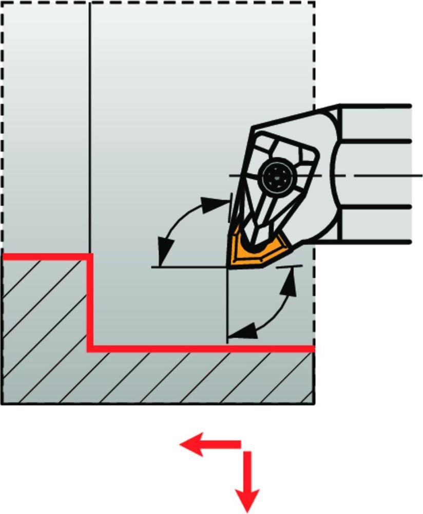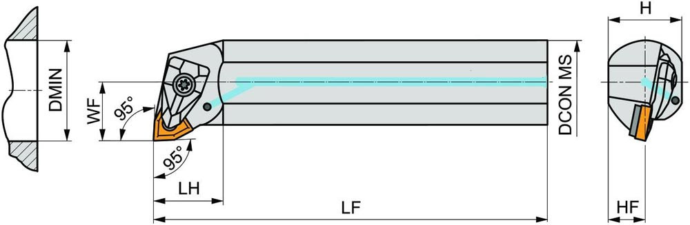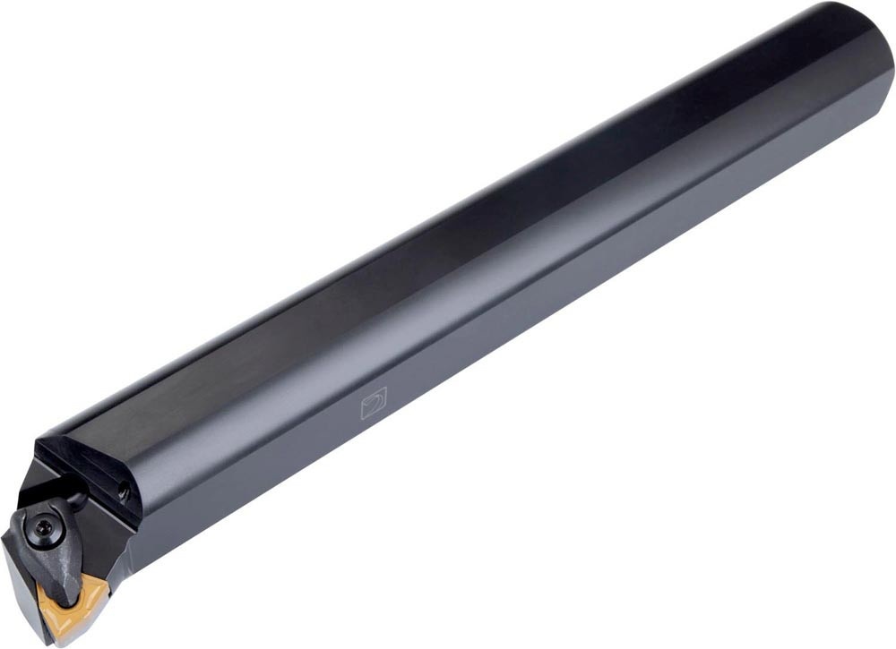Dreh-Bohrstange doppelt geklemmt zum spannen von 80° Trigonal negative Wendeschneidplatten mit einem Innenkreisdurchmesser von 9.525mm · 4.76mm Dick (ISO Bezeichnung WN.. 0604.. ) · linke Ausführung zum 95° Stirn-und Längsdrehen mit abgesetzem Schaft · Stahl mit Kühlkanalbohrung · 25mm Durchmesser x 300mm Länge für Innenkegeldrehen und Längsdrehen mit und ohne Schulter