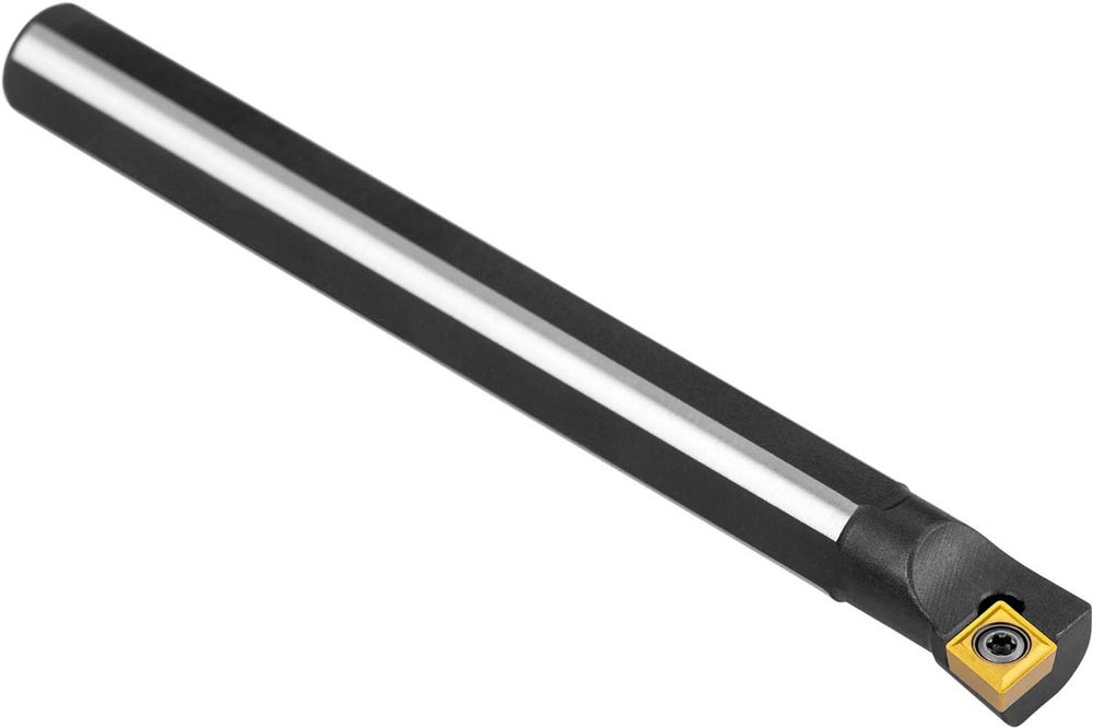 Dreh-Bohrstange mit Schraubklemmung zum spannen von 80° Rhombus positive Wendeschneidplatten mit einem Innenkreisdurchmesser von 6.35mm · 2.38mm Dick (ISO Bezeichnung CC.. 0602.. ) · linke Ausführung zum 90° Längsdrehen mit abgesetzem Schaft · Stahl ohne Kühlkanalbohrung · 10mm Durchmesser x 100mm Länge für Innenkegeldrehen und Längsdrehen ohne Schulter