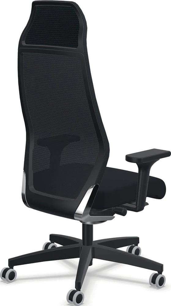 mit Synchrontechnik (mit Armlehnen) · für überwiegend sitzende Tätigkeit · stabiles Kunststoff-Fußkreuz, schwarz · mit seitlicher Feineinstellung des Rückenlehnengegendrucks mit wenigen Umdrehungen · mit Netzrückenlehne und Nackenstütze · Sitztiefenverstellung 70 mm per Schiebesitz · Armlehnen höhen-/breiten- und tiefenverstellbaren, mit PU-Auflage · Sitzbezug aus 100 % Polyester · Sitzfläche B 500 x T 480-550 mm · Lehnenhöhe 840 mm · Universalrollen für weiche und harte Böden