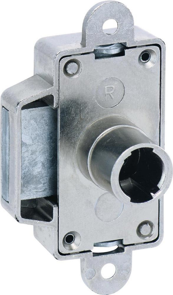 Drehstangenschloss mit Seitenriegel · aufliegend · Metall vernickelt · Dornmaß 25 mm · Anschlagrichtung rechts/links · für Materialstärken bis 19 mm · ohne Schließeinsatz · Stangen 6 x 5 mm und 8 x 7 mm geteilt