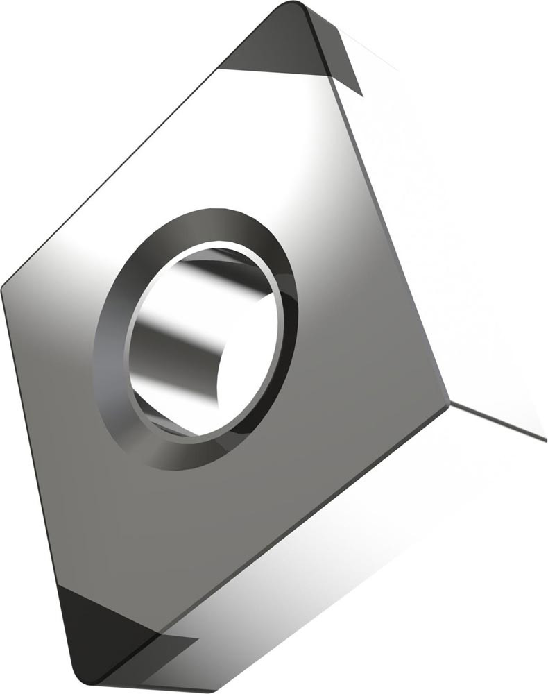 Wendeschneidplatte zum Hartdrehen mit 2 einseitig gekippten CBN-Ecken · 80° Rhomboid mit Innenkreisdurchmesser 12.7mm · 4.76mm Dick · 0.8mm Schneidenradius · Wiederholgenauigkeit nach ISO-Toleranzklasse G · verrundeter und facettierter Schneidkante T-land -20°/0.1mm · im Substrat TB310 · unbeschichtetes CBN im ISO-Bereich H01-H10 · zur Hochvorschub Bearbeitung von gehärtetem Stahl