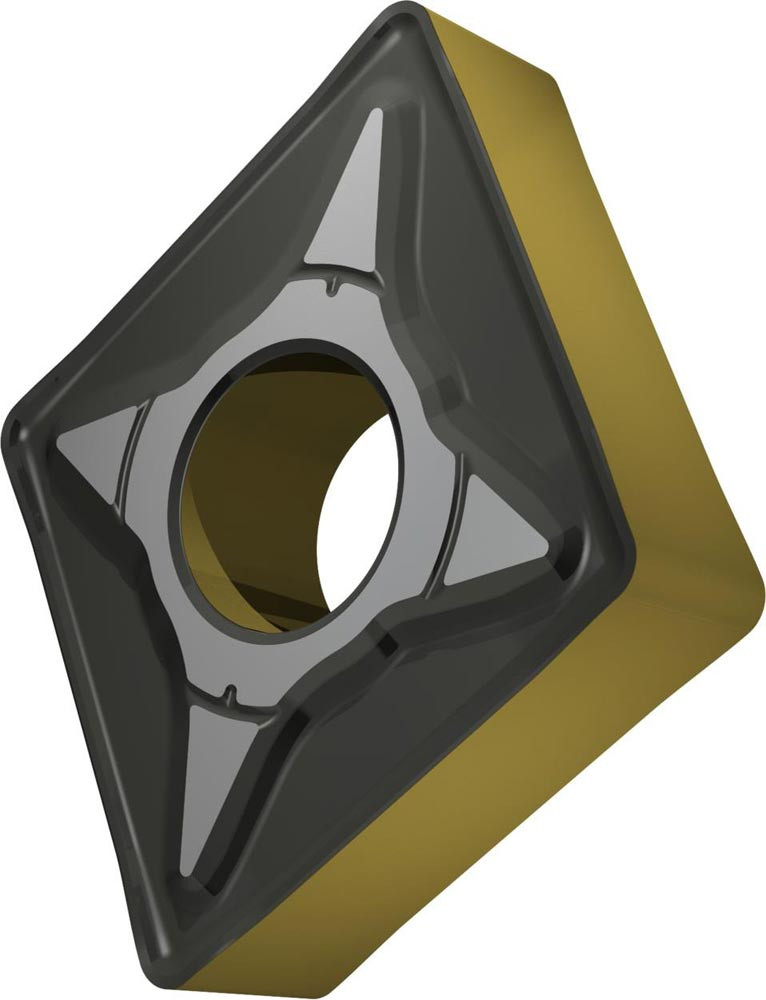 Doppelseitige negative Drehwendeschneidplatte · 80° Rhombisch mit Innenkreisdurchmesser von 19.05mm · 6.35mm Dick · 1.2mm Radius und Indexgenauigkeit nach ISO-Toleranzklasse-M · Spanbrecher NRM · im Substrat T9415 · MT-CVD beschichtet WC-Co Substrat im ISO-Bereich P05 -P30 · zum medium bis schruppen bearbeiten von Stählen