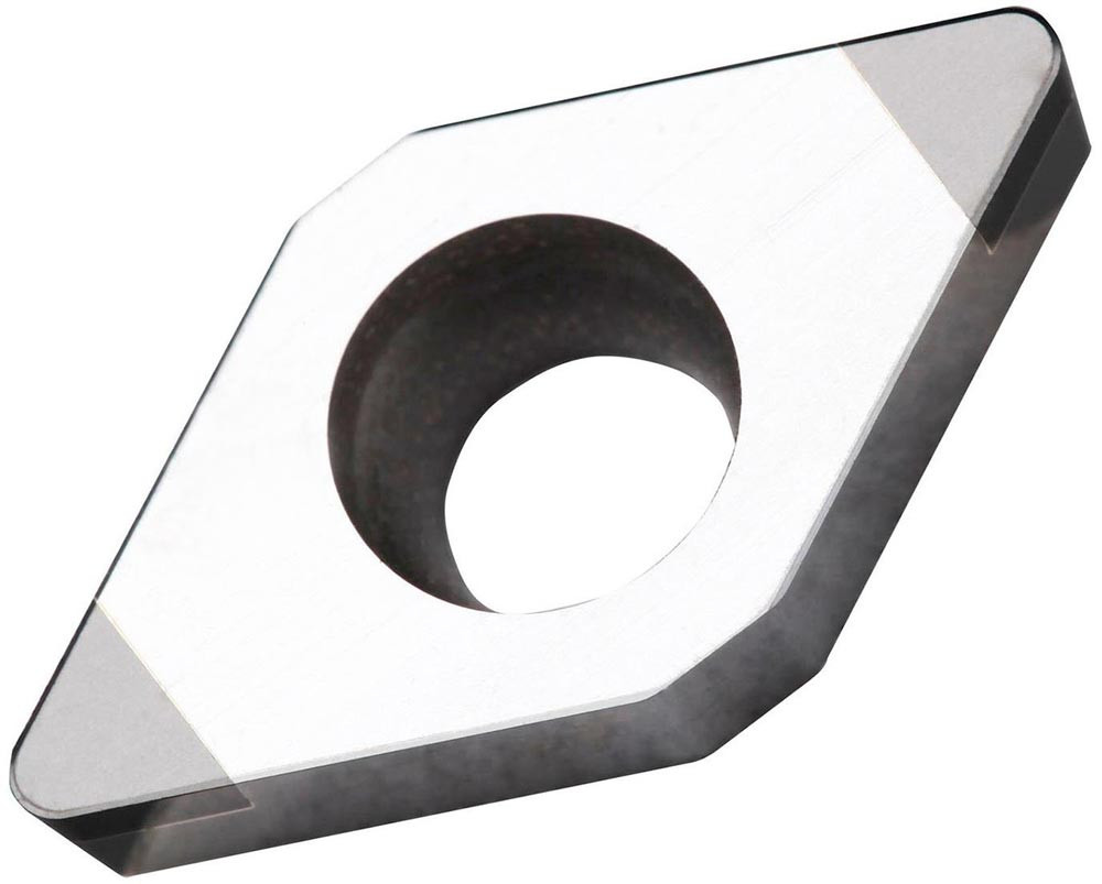 Wendeschneidplatte zum Hartdrehen mit 2 einseitig gekippten CBN-Ecken · 55° Rhomboid mit 7° Freiwinkel · Innenkreisdurchmesser 9.525mm · 3.97mm Dick · 0.8mm Schneidenradius · Wiederholgenauigkeit nach ISO-Toleranzklasse G · verrundeter und facettierter Schneidkante T-land -20°/0.1mm · im Substrat TB310 · unbeschichtetes CBN im ISO-Bereich H01-H10 · zur Hochvorschub Bearbeitung von gehärtetem Stahl