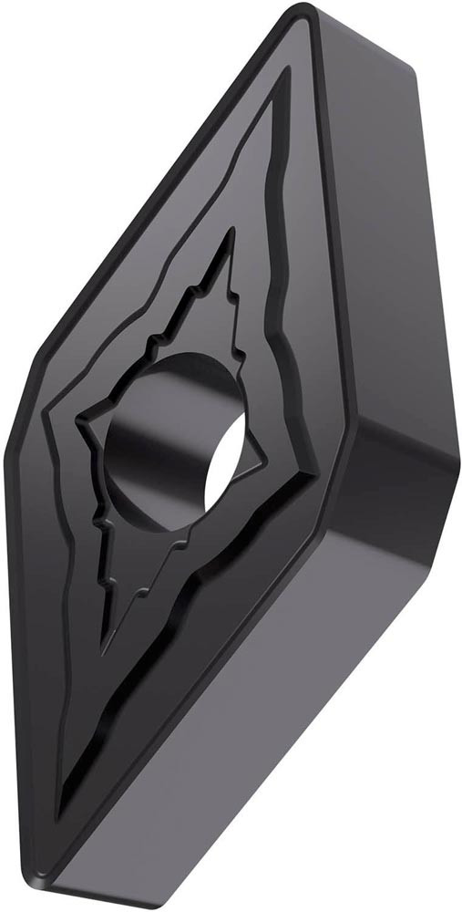 Doppelseitige negative Drehwendeschneidplatte · 55° Rhombisch mit Innenkreisdurchmesser von 12.7mm · 6.35mm Dick · 0.8mm Radius · Indexgenauigkeit nach ISO-Toleranzklasse-M · Spanbrecher NMR mit verrundeter Schneidkante · im Substrat T6310 · PVD beschichtet WC-Co Feinstkornsubstrat in den ISO-Bereichen P01 -P15/M01 -M15 und S01 -S15 · zum schlichten bis schruppen bearbeiten von Stählen · nichtrostenden Stählen und Superlegierungen