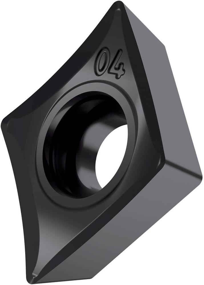 Einseitige positive Drehwendeschneidplatte · 75° Rhombisch mit 7° Freiwinkel · Innenkreisdurchmesser von 7.94mm · 3.18mm Dick · 0.4mm Radius · Indexgenauigkeit nach ISO-Toleranzklasse-G · Spanbrecher SF3 mit verrundeter Schneidkante · im Substrat T6310 · PVD beschichtet WC-Co Feinstkornsubstrat in den ISO-Bereichen M01 -M15/N05 -N20 und S01 -S15 · zum schlichten bis medium bearbeiten von nichtrostenden Stählen · Nichteisenmetallen und Superlegierungen