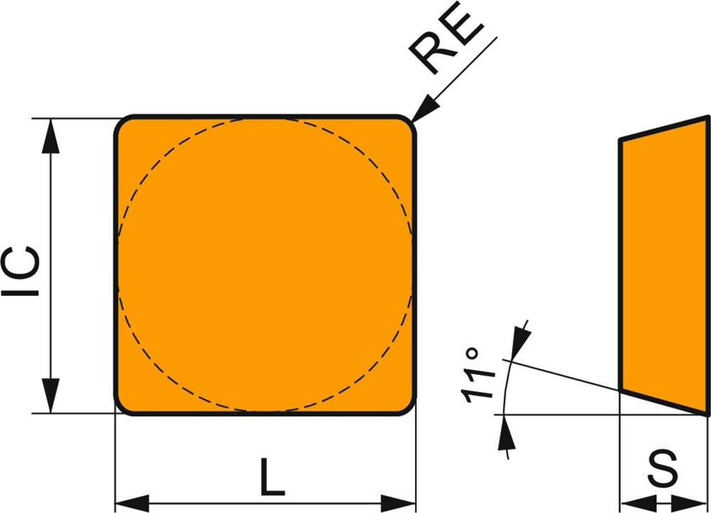 Einseitige positive Drehwendeschneidplatte · Viereckig mit 11° Freiwinkel · Innenkreisdurchmesser von 15.875mm · 4.76mm Dick · 1.2mm Radius und Indexgenauigkeit nach ISO-Toleranzklasse-U · im Substrat 6640 · MT-CVD beschichtet WC-Co Substrat im ISO-Bereich P20 -P40 · zum schlichten bis medium bearbeiten von Stählen