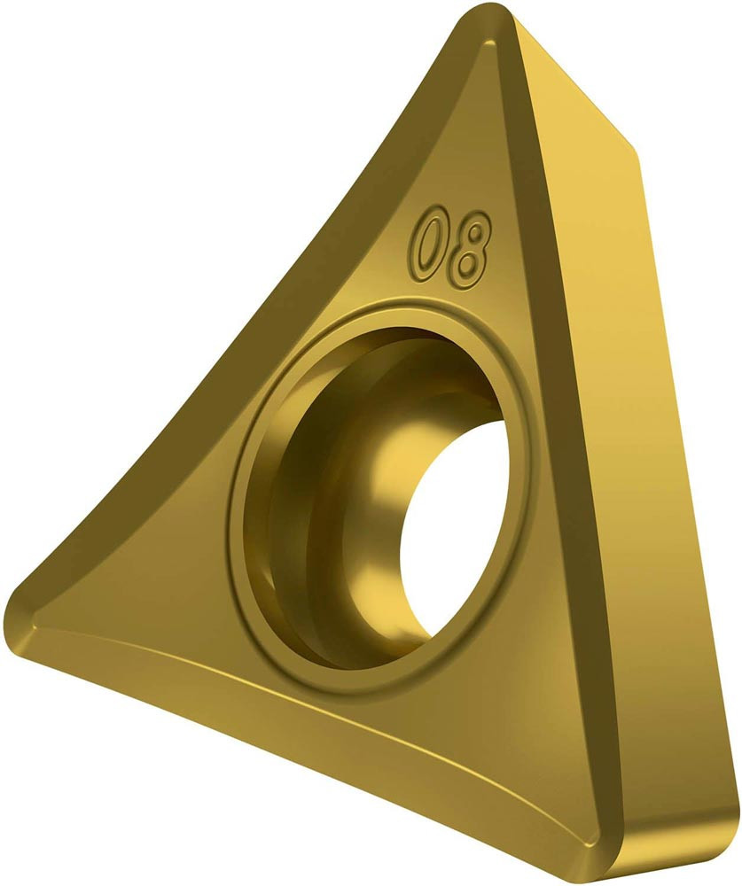 Einseitige positive Drehwendeschneidplatte · Triangular mit 7° Freiwinkel · Innenkreisdurchmesser von 6.35mm · 2.38mm Dick · 0.2mm Radius · Indexgenauigkeit nach ISO-Toleranzklasse-G · Spanbrecher SF3 mit verrundeter Schneidkante · im Substrat T8315 · PVD beschichtet WC-Co Feinkornsubstrat in den ISO-Bereichen M05 -M20 und N05 -N25 · zum schlichten bis medium bearbeiten von nichtrostenden Stählen und Nichteisenmetallen