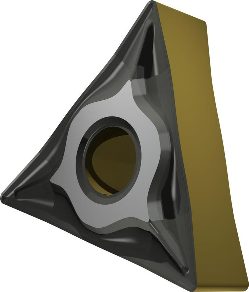 Doppelseitige negative Drehwendeschneidplatte · Triangular mit Innenkreisdurchmesser von 9.525mm · 4.76mm Dick · 0.4mm Radius · Indexgenauigkeit nach ISO-Toleranzklasse-M · Spanbrecher NF mit verrundeter Schneidkante · im Substrat T9415 · MT-CVD beschichtet WC-Co Substrat im ISO-Bereich P05 -P30 · zum schlichten bis medium bearbeiten von Stählen