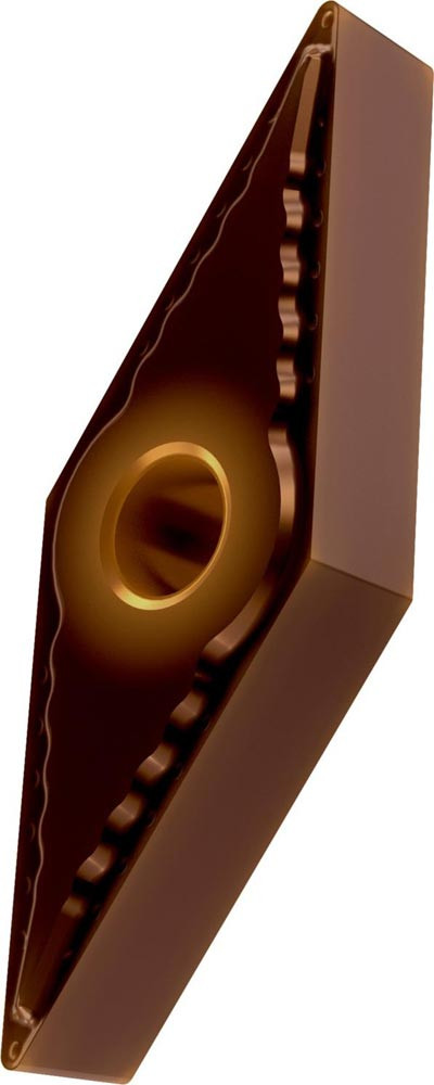 Doppelseitige negative Drehwendeschneidplatte · 35° Rhombisch mit Innenkreisdurchmesser von 9.525mm · 4.76mm Dick · 0.4mm Radius · Indexgenauigkeit nach ISO-Toleranzklasse-M · Spanbrecher FF mit verrundeter Schneidkante · im Substrat T8430 · PVD beschichtet WC-Co Feinkornsubstrat in den ISO-Bereichen P20 -P40 und M20 -M35 · zum schlichten bearbeiten von Stählen und nichtrostenden Stählen