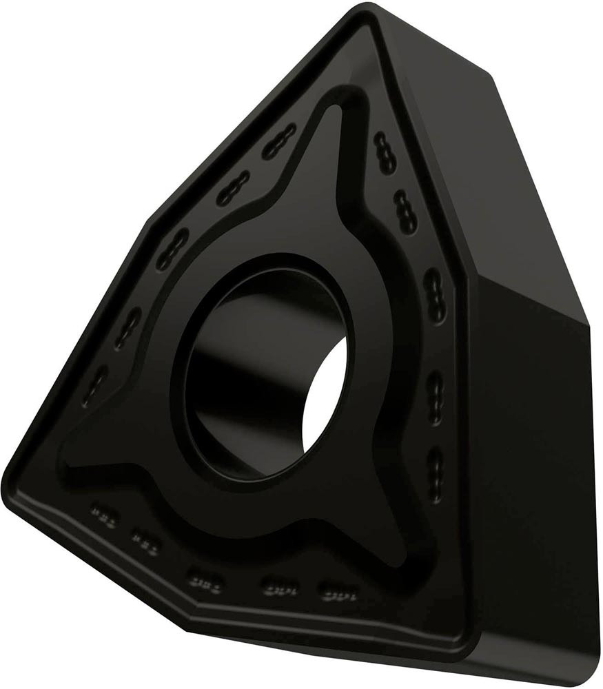 Doppelseitige negative Drehwendeschneidplatte · 80° Trigon mit Innenkreisdurchmesser von 12.7mm · 4.76mm Dick · 1.2mm Radius · Indexgenauigkeit nach ISO-Toleranzklasse-M · Spanbrecher RM mit verrundeter Schneidkante · im Substrat T9335 · MT-CVD beschichtet functionally graded WC-Co carbide in den ISO-Bereichen P20 -P45 und M15 -M40 · zum medium bis schruppen bearbeiten von Stählen und nichtrostenden Stählen