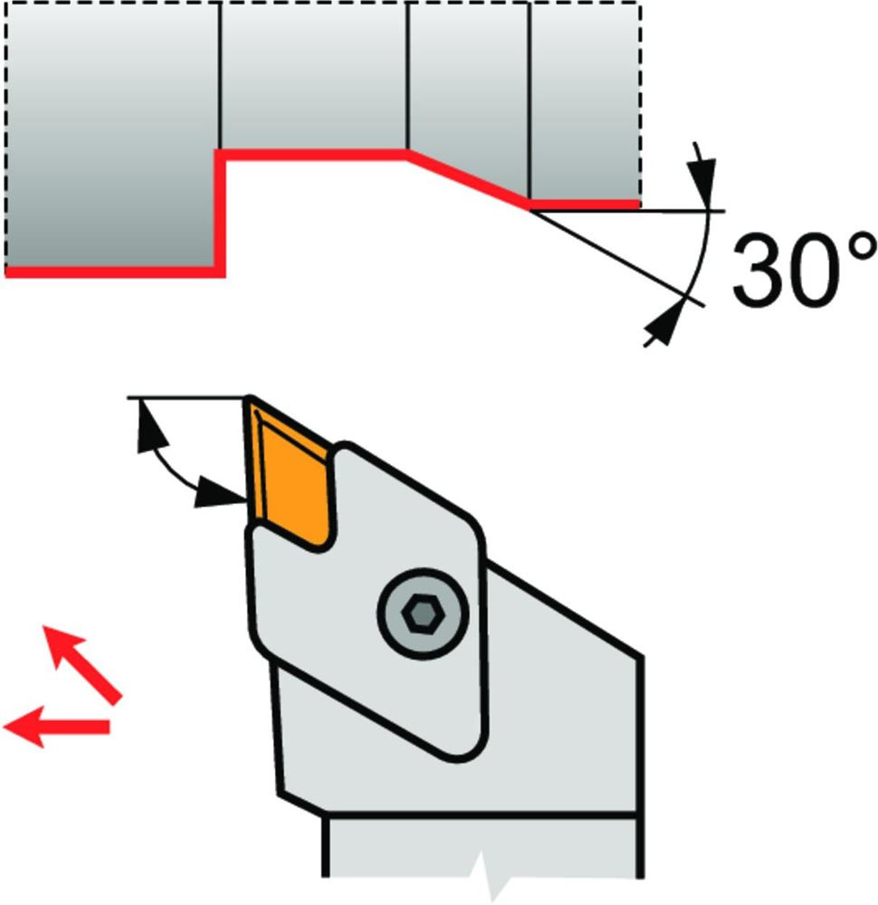 Dreh-Trägerwerkzeug von oben geklemmt zum spannen von 55° Parallelogramm negative Wendeschneidplatten mit einem Innenkreisdurchmesser von 9.525mm · 4.76mm Dick (ISO Bezeichnung KN.X 1604…L ) · linke Ausführung zum 93° Stirndrehen mit abgesetzem Schaft · 25mm Werkzeughöhe x 25mm Breite x 150mm Länge für entgraten · Kegeldrehen · Kopierdrehen in einer und mehreren Richtungen und Längsdrehen mit und ohne Schulter