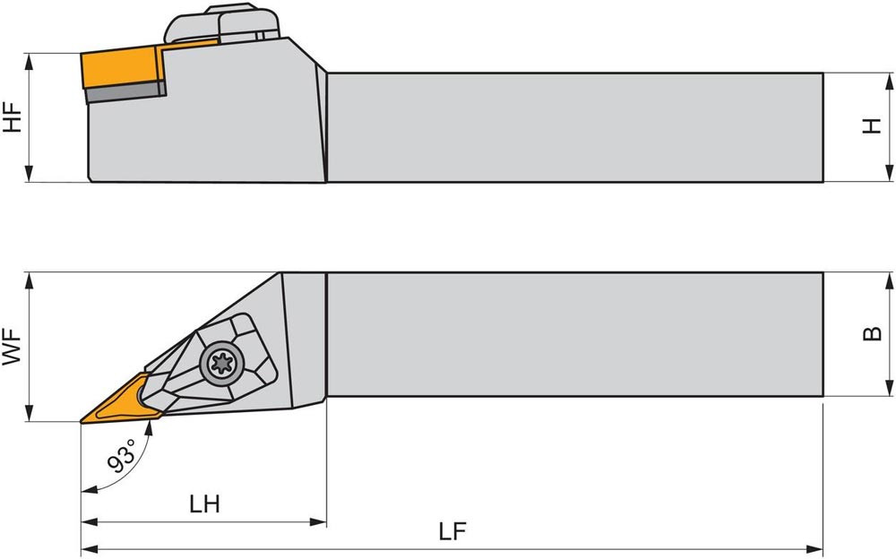 Dreh-Trägerwerkzeug doppelt geklemmt zum spannen von 35° Rhombus negative Wendeschneidplatten mit einem Innenkreisdurchmesser von 9.525mm · 4.76mm Dick (ISO Bezeichnung VN.. 1604.. ) · rechte Ausführung zum 93° Stirndrehen mit abgesetzem Schaft · 32mm Werkzeughöhe x 25mm Breite x 170mm Länge für entgraten · Kegeldrehen · Kopierdrehen in einer und mehreren Richtungen und Längsdrehen mit und ohne Schulter