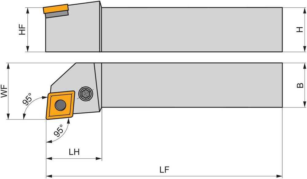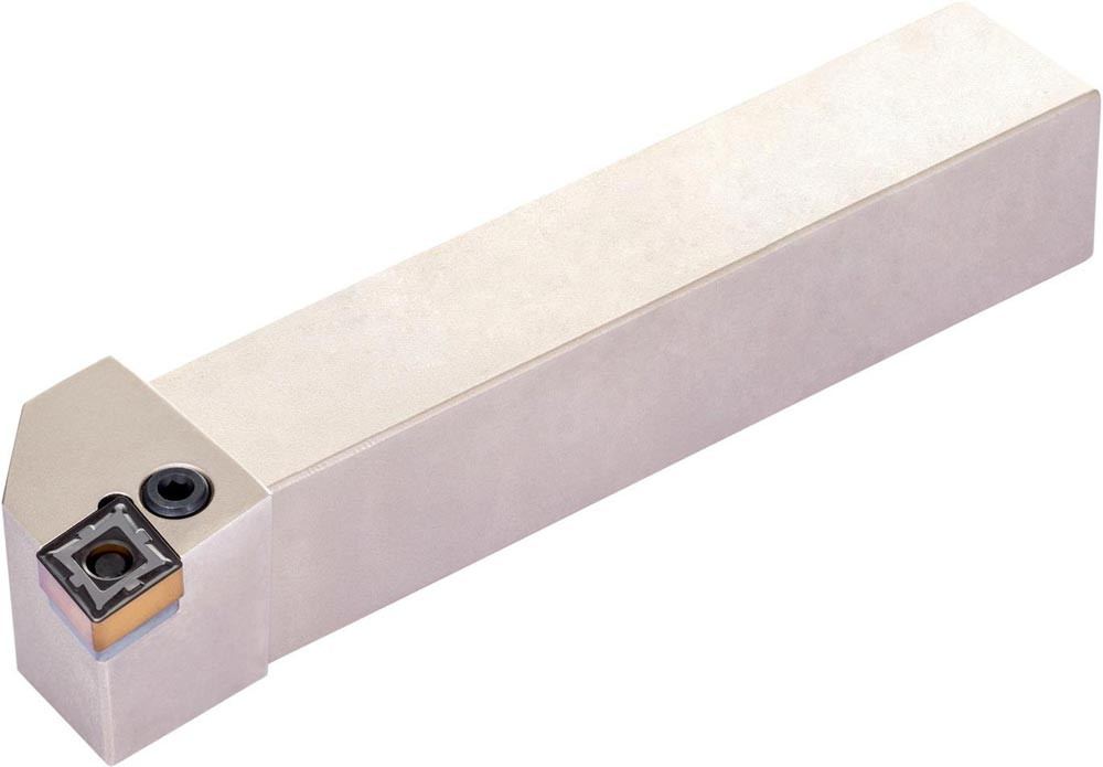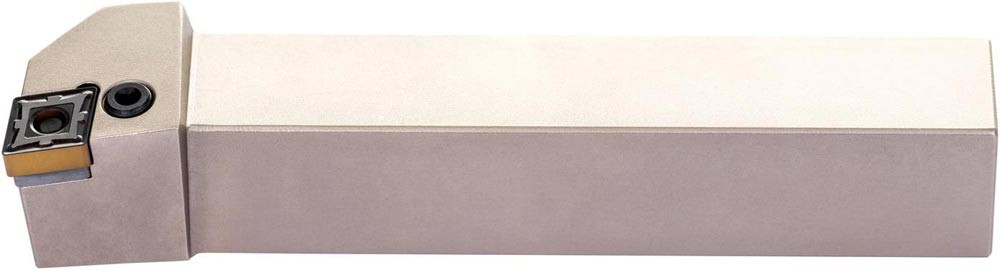 Dreh-Trägerwerkzeug mit Kniehebelklemmung zum spannen von 80° Rhombus negative Wendeschneidplatten mit einem Innenkreisdurchmesser von 12.7mm · 4.76mm Dick (ISO Bezeichnung CN.. 1204.. ) · rechte Ausführung zum 95° Stirn-und Längsdrehen mit abgesetzem Schaft · 20mm Werkzeughöhe x 20mm Breite x 125mm Länge für Kegeldrehen · Stirndrehen mit und ohne Schulter und Längsdrehen mit und ohne Schulter