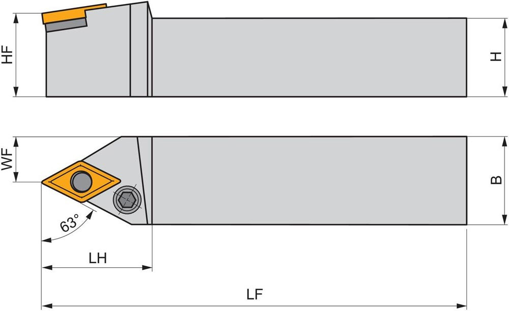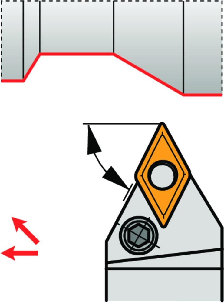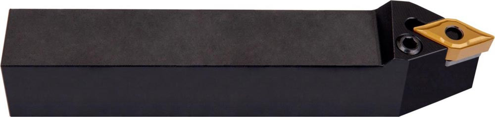 Dreh-Trägerwerkzeug mit Kniehebelklemmung zum spannen von 55° Rhombus negative Wendeschneidplatten mit einem Innenkreisdurchmesser von 9.525mm · 4.76mm Dick (ISO Bezeichnung DN.. 1104.. ) · linke Ausführung zum 62°30' Stirndrehen mit Zylinderschaft · 20mm Werkzeughöhe x 20mm Breite x 125mm Länge für Kopierdrehen in einer und mehreren Richtungen