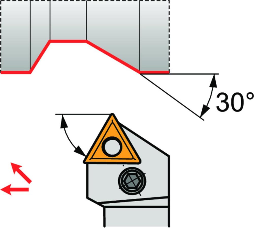 Dreh-Trägerwerkzeug mit Kniehebelklemmung zum spannen von Triangular negative Wendeschneidplatten mit einem Innenkreisdurchmesser von 9.525mm · 4.76mm Dick (ISO Bezeichnung TN.. 1604.. ) · rechte Ausführung zum 60° Stirndrehen mit abgesetzem Schaft · 25mm Werkzeughöhe x 25mm Breite x 150mm Länge für Kegeldrehen und Kopierdrehen in einer und mehreren Richtungen