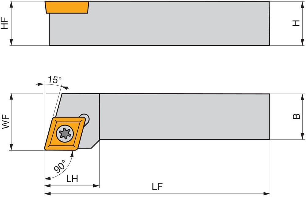 Dreh-Trägerwerkzeug mit Schraubklemmung zum spannen von 75° Rhombus positive Wendeschneidplatten mit einem Innenkreisdurchmesser von 7.94mm · 3.18mm Dick (ISO Bezeichnung EC.. 0803.. ) · rechte Ausführung zum 90° Stirndrehen mit abgesetzem Schaft · 12mm Werkzeughöhe x 12mm Breite x 160mm Länge für entgraten · Kegeldrehen und Längsdrehen ohne Schulter