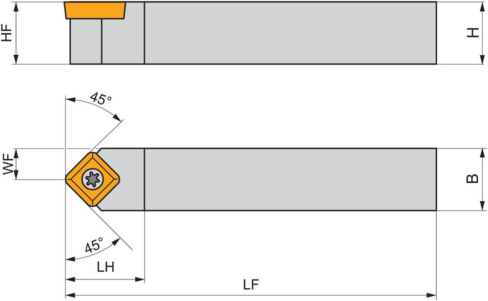 Dreh-Trägerwerkzeug mit Schraubklemmung zum spannen von Viereckig positive Wendeschneidplatten mit einem Innenkreisdurchmesser von 12.7mm · 4.76mm Dick (ISO Bezeichnung SC.. 1204.. ) · neutrale Ausführung zum 45° Stirndrehen mit Zylinderschaft · 25mm Werkzeughöhe x 25mm Breite x 150mm Länge für entgraten · Kegeldrehen · Kopierdrehen in einer und mehreren Richtungen und Längsdrehen ohne Schulter