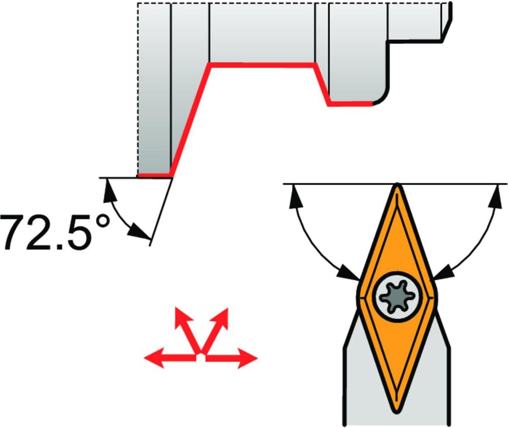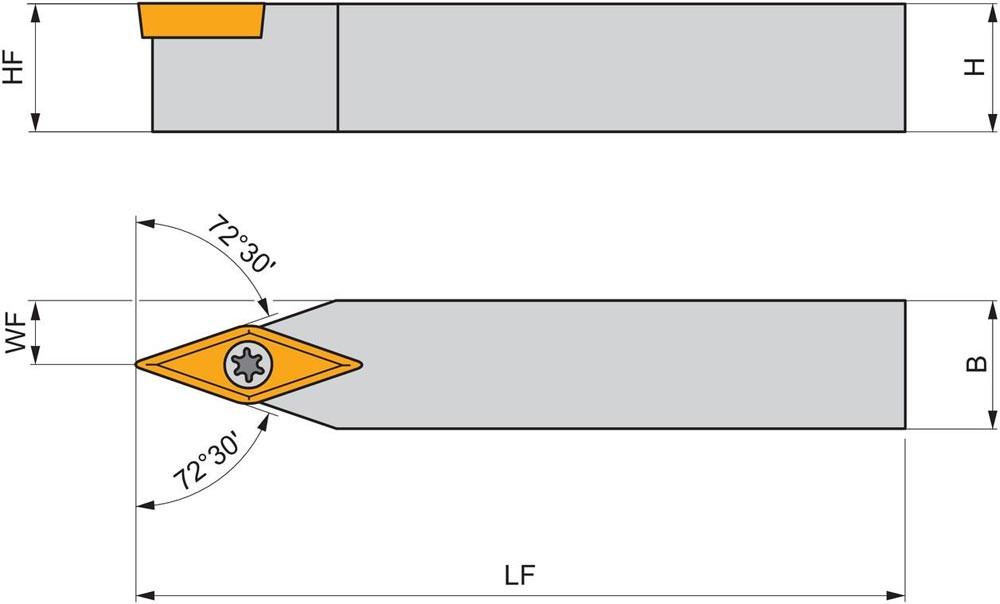 Dreh-Trägerwerkzeug mit Schraubklemmung zum spannen von 35° Rhombus positive Wendeschneidplatten mit einem Innenkreisdurchmesser von 6.35mm · 3.18mm Dick (ISO Bezeichnung VB.. 1103.. ) · neutrale Ausführung zum 72°30' Stirndrehen mit Zylinderschaft · 20mm Werkzeughöhe x 20mm Breite x 125mm Länge für Kegeldrehen · Kopierdrehen in einer und mehreren Richtungen und Längsdrehen ohne Schulter