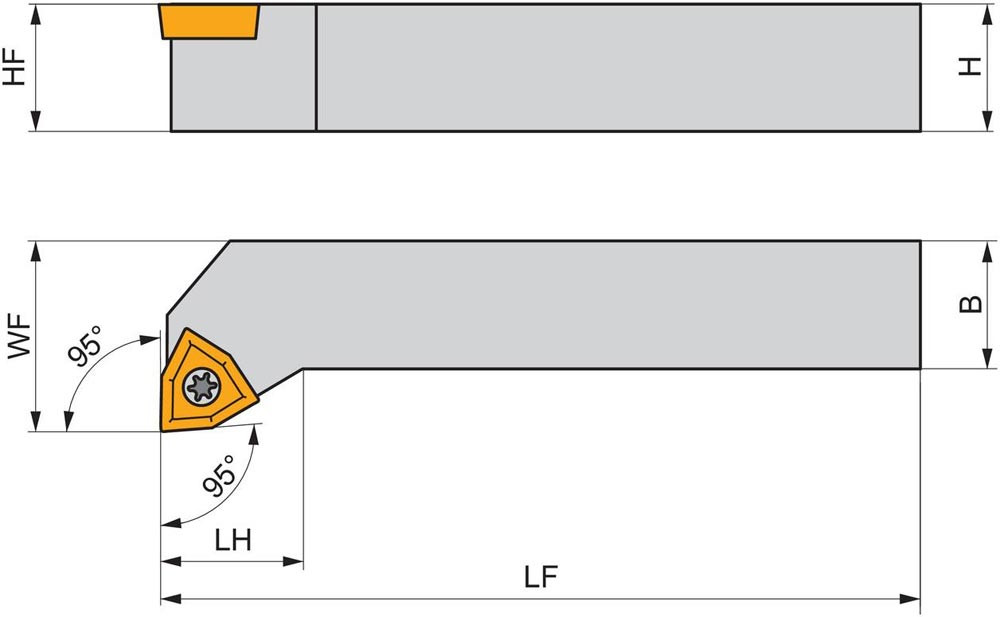 Dreh-Trägerwerkzeug mit Schraubklemmung zum spannen von 80° Trigonal positive Wendeschneidplatten mit einem Innenkreisdurchmesser von 12.7mm · 4.76mm Dick (ISO Bezeichnung WC.. 0804.. ) · rechte Ausführung zum 95° Stirn-und Längsdrehen mit abgesetzem Schaft · 25mm Werkzeughöhe x 25mm Breite x 150mm Länge für Kegeldrehen · Stirndrehen mit und ohne Schulter und Längsdrehen mit und ohne Schulter