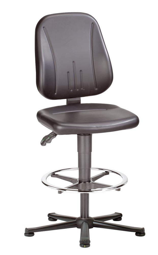 ∙ Gefertigt nach DIN 68877 ∙ Gasfeder-Sitzhöhenverstellung ∙ Kontakt-Rückenlehne stufenlos arretierbar, sowie in Höhe und Neigung individuell einstallbar ∙ Kippsicheres, stabiles Fünffuß-Untergestell aus Stahl ∙ Leitfähig nach DIN EN 61340-5-1 ∙ Farbe schwarz