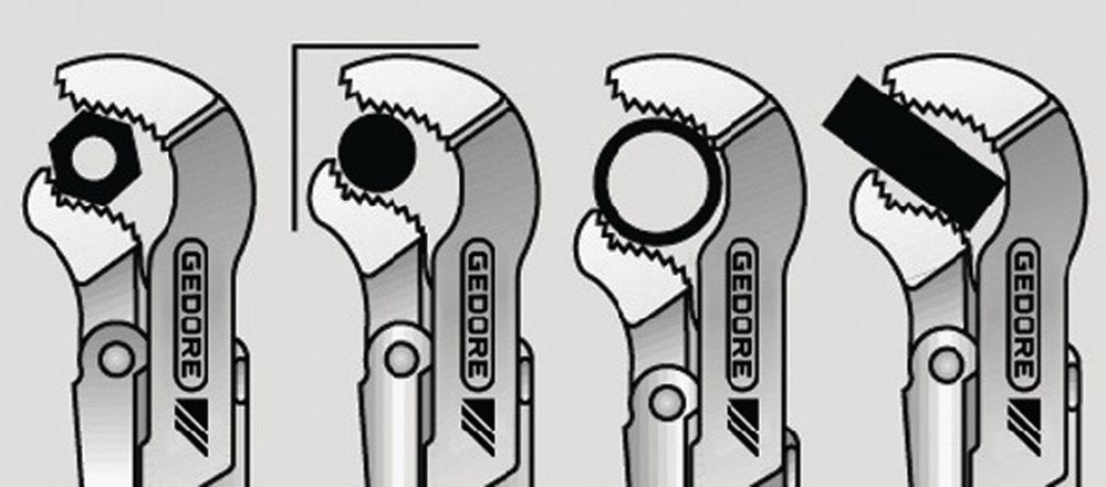 Hochleistungs-Dreipunktrohrzange · Chrom-Vanadium-Stahl · gesenkgeschmiedet · ganz vergütet · Zahnung zusätzlich induktiv gehärtet · Kopf geschliffen · Stellmuttersicherung · S-Maul · für Arbeiten in beengten Raumverhältnissen