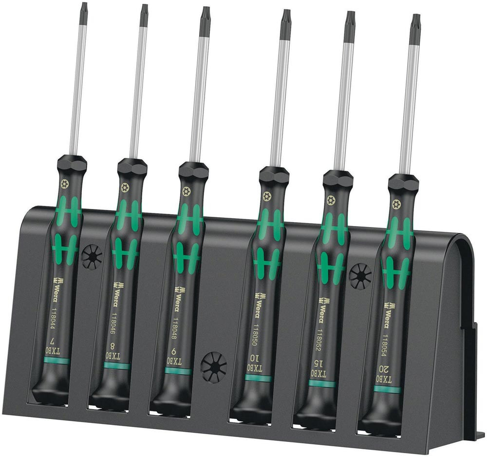 Hochwertiger Wera Micro Schraubendrehersatz für feinmechanische Verschraubungen. Für TORX(r) Sicherheitsverschraubungen: TORX(r) BO Schrauben besitzen in ihrem Antriebsprofil einen vorstehenden Zapfen. Damit wird unerlaubtes Lösen verhindert · denn mit ″normalen″ TORX(r) Werkzeugen können diese Schrauben nicht betätigt werden. Nur spezielle TORX(r) BO Werkzeuge weisen eine Bohrung auf · in die der Zapfen aufgenommen wird. Durch Abstützen der Hand auf der Drehkappe und durch die Schnelldrehzone unterhalb der Drehkappe ist blitzschnelles Zwirbeln möglich. Zeitintensives Umgreifen entfällt. Kraftzone mit integrierten Weichzonen sorgt für die Übertragung hoher Löse- und Anzugsmomente. Präzisionszone für den richtigen Drehwinkel bei Justierarbeiten. Die Wera Black Point-Spitze bietet Passgenauigkeit und optimierten Korrosionsschutz. Vorteile: Kraftform Micro Schraubendrehersatz für Innen TORX(r) Schrauben mit Sicherungsstift. Mehrkomponentiger Kraftform Micro Griff mit Abrollschutz und drehbarer Kappe. Die Wera Black Point-Spitze bietet Passgenauigkeit und optimierten Korrosionsschutz. Mit Werkzeugfinder Take it easy: Farbkennzeichnung nach Profilen und Größenstempelung. Inklusive praktischem Rack zur übersichtlichen Aufbewahrung der Schraubendreher. Z. B. für Elektroniker · Optiker · Feinmechaniker · Juweliere oder EDV-Hardwaremonteure. Hochwertiger Wera Micro Schraubendrehersatz für feinmechanische Verschraubungen. Für TORX(r) Sicherheitsverschraubungen: TORX(r) BO Schrauben besitzen in ihrem Antriebsprofil einen vorstehenden Zapfen. Damit wird unerlaubtes Lösen verhindert · denn mit ″normalen″ TORX(r) Werkzeugen können diese Schrauben nicht betätigt werden. Nur spezielle TORX(r) BO Werkzeuge weisen eine Bohrung auf · in die der Zapfen aufgenommen wird. Durch Abstützen der Hand auf der Drehkappe und durch die Schnelldrehzone unterhalb der Drehkappe ist blitzschnelles Zwirbeln möglich. Zeitintensives Umgreifen entfällt. Kraftzone mit integrierten Weichzonen sorgt für die Übertragung hoher Löse- und Anzugsmomente. Präzisionszone für den richtigen Drehwinkel bei Justierarbeiten. Die Wera Black Point-Spitze bietet Passgenauigkeit und optimierten Korrosionsschutz.