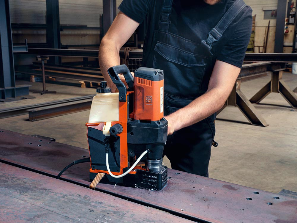 Kleine und leichte 1-Gang Endurance-Magnet-Kernbohrmaschine ∙ Dank einzigartiger Performance wird die Bohrzeit halbiert ∙ Schnittgeschwindigkeiten von bis zu 70 m/min ∙ Extrem verschleißarmes Maschinenkonzept mit bürstenlosem 1 600 W Hochleistungsmotor ∙ Integrierter Kühlmitteltank sorgt für hohe Kernbohrerstandzeiten ∙ Kippsensor stoppt unmittelbar den Bohrmotor beim Verrutschen oder Kippen der Maschine