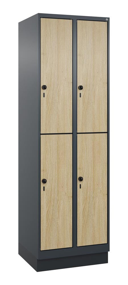 Fächerschrank, doppelstöckig, Sockel, 2x2 Fächer, Abt.B 300 mm, BxTxH 600x500x1950 mm, HPL-Dekorfront, RAL 7016/Dekor Eiche Sereno