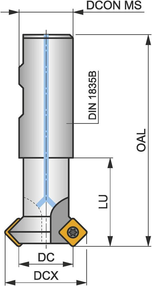 Entgratfräser mit doppelt negativer Geometrie zum spannen von 1 Stück SOMT 09T3.. einseitigen Wendeschneidplatten · Schnittdurchmesser 8 bis maximal 20.5mm mit 45° Anstellwinkel und 16mm Weldon Schaft gemäß DIN 1835B · 90mm Gesamtlänge · Kühlkanalbohrung zum Entgratfräsen mit einer maximalen Schnitttiefe von 4.5mm