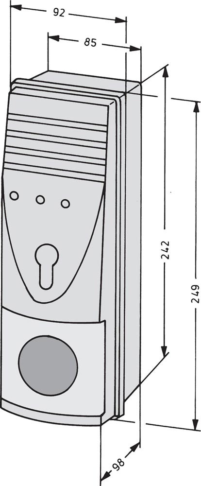 zur Steuerung von elektrischen Verriegelungselementen im Verlauf von Flucht- und Rettungswegen zugelassen gem. EltVTR · Nottaste beleuchtet mit wiederverwendbarer, nicht splitternder Schutzhaube · integrierte optische Türzustandsanzeige (grün / rot / gelb) für entriegelt / verriegelt / Alarm · Hinweisschild Nottaste · Alarmsignal und Sabotagekontakt · Schlüsseltaster zur Türsteuerung · mit Euro-Profilhalbzylinder, inkl. 3 Schlüssel · einstellbare Zeitabläufe für Kurzzeitentriegelung, Voralarm, Alarmzeit · Überwachung der Türöffnungszeit bei Kurzeitentriegelung · Anschlüsse: Schraubklemmen
