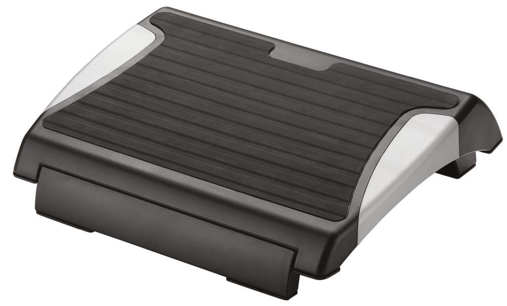 · Fußstütze aus bruchsicherem Kunststoff · Rutschhemmende Gummiauflage · Höhenverstellbar in 4 Stufen und 4 Neigungen · Schwarz