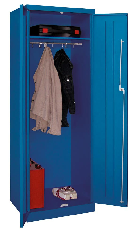 Garderobenschrank mit Sockel, 1 fester Fachboden, 1 Stange mit 10 Haken, BxTxH 600x500x1800 mm, RAL 5015 E1574975