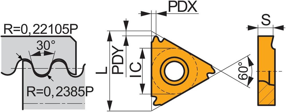 Einseitige Gewindedreh-Wendeschneidplatte · dreieckig mit einem Innenkreisdurchmesser von 9.525mm · für rechtsschneidende Werkzeuge für RD-Außengewinde mit 8TPI · T8030 PVD beschichtet feinkörniges WC-Co-Hartmetall innerhalb der ISO-Substrats-Bereiche P25-P40/M20-M35 und K20-K40 zum zerspanen von Stahl · Edelstahl und Guss