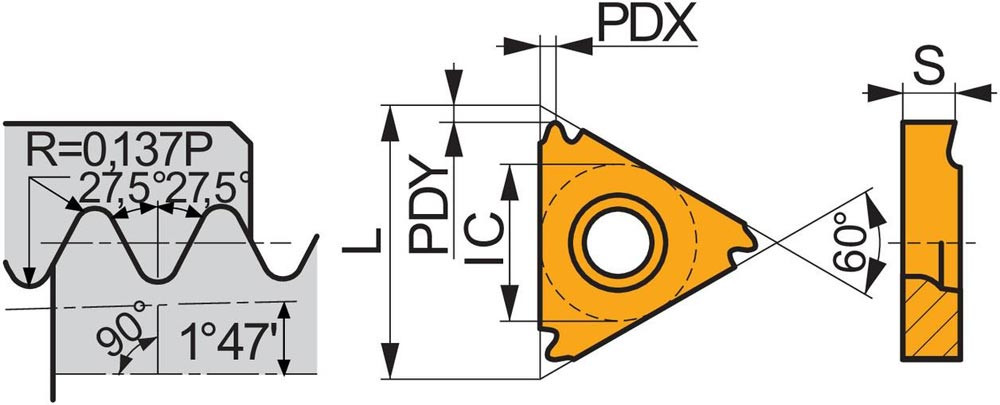Einseitige Gewindedreh-Wendeschneidplatte · dreieckig mit einem Innenkreisdurchmesser von 9.525mm · für rechtsschneidende Werkzeuge für BSPT-Außengewinde mit 11TPI · T8030 PVD beschichtet feinkörniges WC-Co-Hartmetall innerhalb der ISO-Substrats-Bereiche P25-P40/M20-M35 und K20-K40 zum zerspanen von Stahl · Edelstahl und Guss