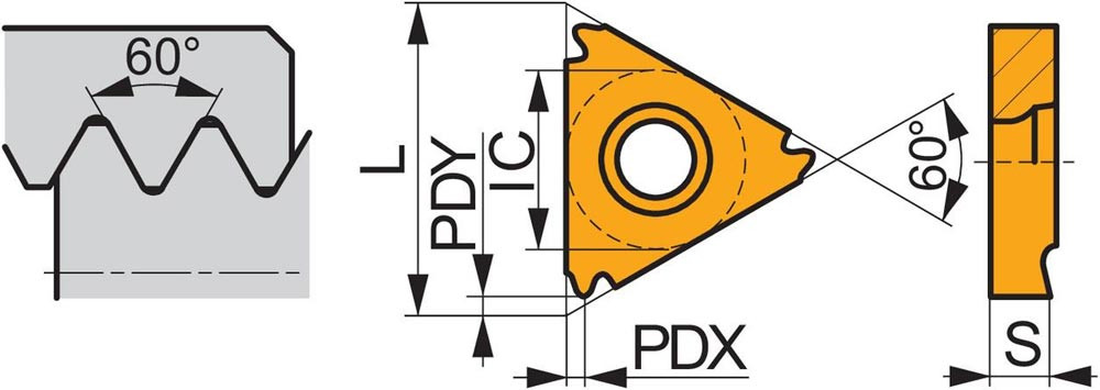 Einseitige Gewindedreh-Wendeschneidplatte · dreieckig mit einem Innenkreisdurchmesser von 9.525mm · für rechtsschneidende Werkzeuge Teilprofil für ISO-metrisches und UN-Innengewinde mit 1.75 bis 3mm Steigung und 14 bis 8TPI · T8030 PVD beschichtet feinkörniges WC-Co-Hartmetall innerhalb der ISO-Substrats-Bereiche P25-P40/M20-M35 und K20-K40 zum zerspanen von Stahl · Edelstahl und Guss