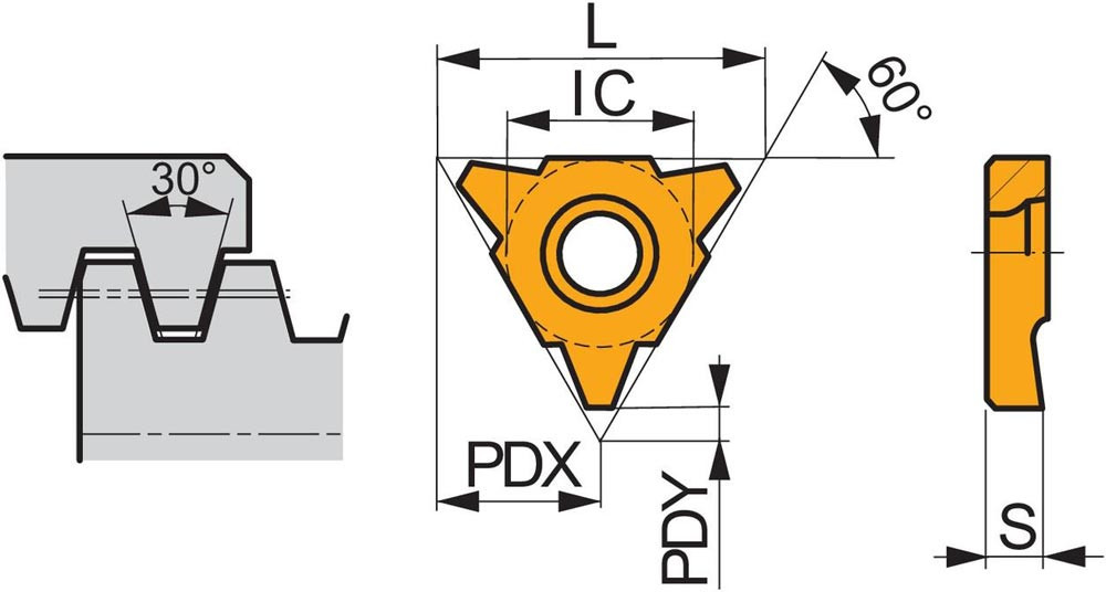 Einseitige Gewindedreh-Wendeschneidplatte · dreieckig mit einem Innenkreisdurchmesser von 12.7mm · für rechts-und linksschneidende Werkzeuge für Trapezförmiges TR-Innengewinde mit 6mm Steigung · T8030 PVD beschichtet feinkörniges WC-Co-Hartmetall innerhalb der ISO-Substrats-Bereiche P25-P40/M20-M35 und K20-K40 zum zerspanen von Stahl · Edelstahl und Guss in Kombination mit einer SI (RL) -S Gewindebohrstange
