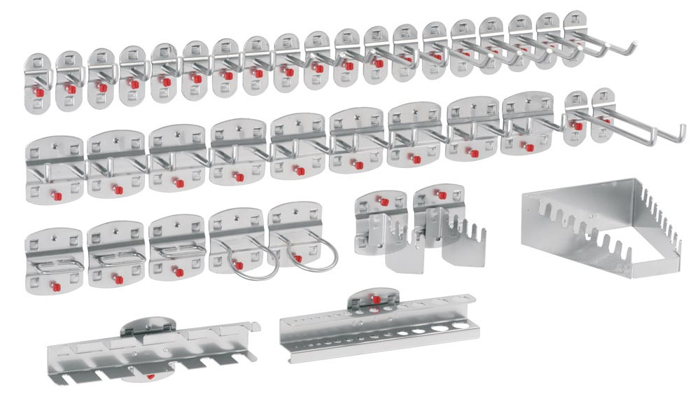 40-teilig Lieferumfang: 9 Werkzeughalter mit schrägem Ende, 12 Werkzeughalter mit senkrechtem Ende, 9 doppelte Werkzeughalter, 3 Zangenhalter, 2 Maschinenhalter, 1 Schraubenschlüsselhalter, 1 Schraubendreherhalter, 1 Bohrerhalter, 2 Sägenhalter