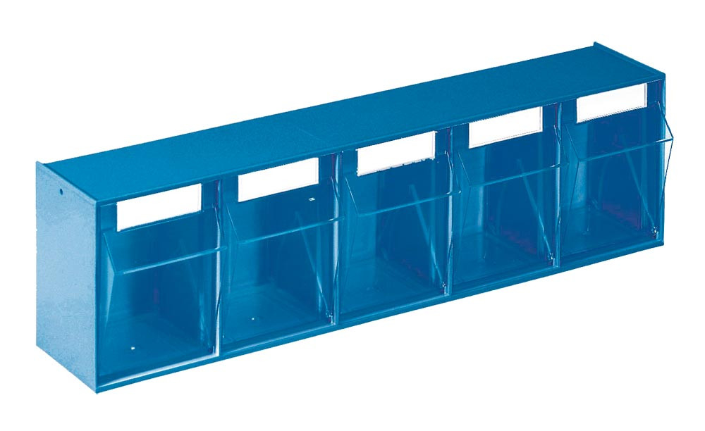 Klarsichtbehälter aus Kunststoff in blauem Gehäuse aus schlagfestem Polystyrol · Behälter sind zur Entnahme nach vorn schwenkbar und lassen sich herausnehmen · Gehäusebreite 600 mm · stapelbar und für die Wandbefestigung geeignet