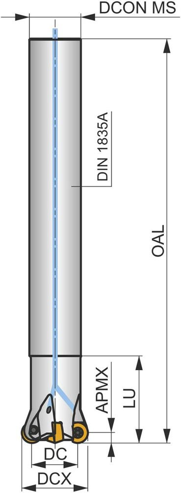 Kopier-Planfräser mit doppelt negativer Geometrie zum spannen von 3 Stück RCMT 10T3MO.. einseitigen Wendeschneidplatten · Schnittdurchmesser 25mm mit 20mm Zylinderschaft gemäß DIN 1835A · 34mm Funktionslänge 170mm Gesamtlänge · Kühlkanalbohrung zum Planfräsen · Kopierfräsen · Rampen · Helikalen Fräsen und progressiven Eintauchen mit einer maximalen Schnitttiefe von 5.0mm
