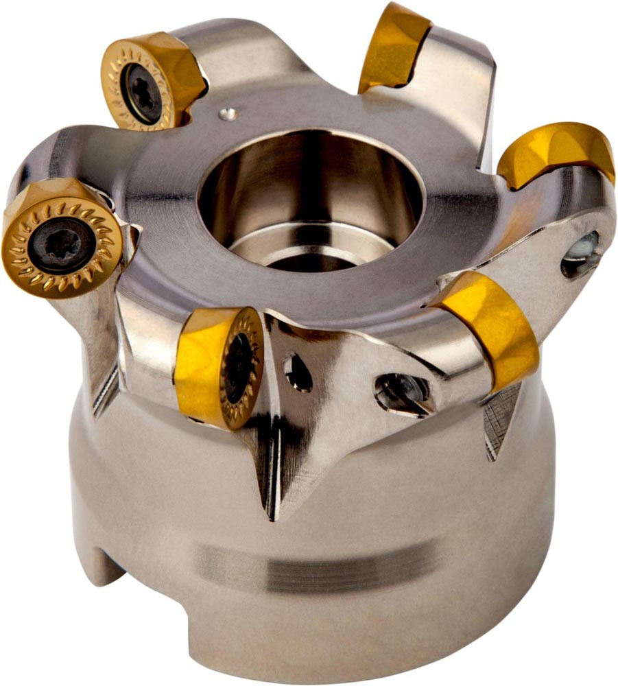 Kopier-Planfräser mit doppelt negativer Geometrie zum spannen von 6 Stück RCMT 10T3MO.. einseitigen Wendeschneidplatten · Schnittdurchmesser 50mm mit 22mm Verbindungsbohrung gemäß DIN 8030-A · 40mm Überstandslänge · Kühlkanalbohrung zum Planfräsen · Kopierfräsen · Rampen · Helikalen Fräsen und progressiven Eintauchen mit einer maximalen Schnitttiefe von 5.0mm