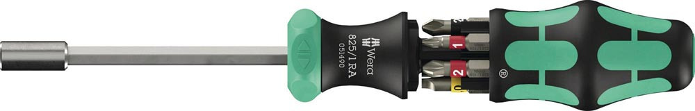 Schraube · intuitives Umschalten: Schalte ich nach rechts – schraube ich nach rechts, schalte ich nach links – schraube ich nach links · integriertes Bit-Magazin mit 6x 25 mm Bits · BiTorsion Bits · mit Werkzeugfinder Take it easy: Farbkennzeichnung nach Profilen und Größenstempelung · Universalhalter mit Edelstahlhülse und starkem Dauermagnet · Bestückung: